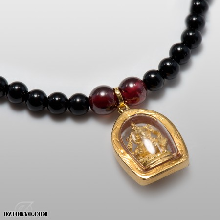 Featuring the Hindu God Ganesh as the center charm on a natural Onyx and Garnet beads long necklace decorated with white OzTKY skulls at the back.